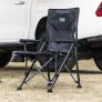 The ARB Base Camp Chair is the perfect all-round chair for traveling. It features a sturdy, sleek black steel frame with contrasting charcoal crossbars. The chair's body is made from 600D polyester and 420D ripstop panels and features a tonal print and internal padding. Padded armrests provide homelike comfort. The chair also features a rear mesh storage pocket and a swivel cup holder to keep your drink close. A spacious 600D polyester carry bag accompanies the chair, featuring webbing straps and a premium shoulder pad for easy storage and carrying.