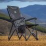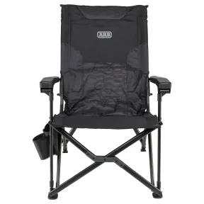 The ARB Pinnacle Camp Chair offers a premium seating experience when traveling. It features a sturdy, sleek black steel frame with contrasting charcoal brackets. Its taller back has a quick-release bracket on the rear, making it easier and faster to fold down when you're ready to break camp. The chair's body is made from 600D polyester and 420D ripstop panels and features a tonal print and internal padding. Its extra wide soft touch armrests provide ultimate comfort when in use. Storage is abundant with a rear mesh pocket, a built-in side panel with a cup holder, and additional pockets. To top it all off, the chair has a spacious 600D polyester carry bag featuring webbing straps and a premium shoulder pad for easy storage and carrying.