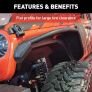 ARIES Jeep fender flares add style and offroad readiness to your Jeep Wrangler JL, featuring rust-free aluminum construction, custom-fit contours and a narrower width to show off larger, offroad tires. Hardened, T6 aluminum alloy construction allows these fender flares to be strong, lightweight and rust-free. To maximum corrosion resistance, they are also covered in a unique textured black powder coat finish that helps hide minor scratches and grime accumulated on the trail. They are also available in paintable, raw aluminum for added customization. ARIES Jeep fender flares are designed to replace the Jeep factory fender flares to better accent larger tires on offroad-style Wranglers. The narrowed width gives them a sleek, trail-ready look, while still maintaining excellent functionality. ARIES Jeep fender flares also feature a vehicle-specific contour to offer a precise fit and added style. ARIES fender flares can also accept ARIES fender flare side markers #1500240 to maintain safety and help keep the vehicle street-legal. ARIES fender flares come with all necessary mounting hardware for a complete installation and are sold in pairs for the front or rear (some drilling may be required).
