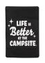 Camco's Life is Better at the Campsite RV Door Window Light Blocking Shade protects your RV interior from the sun and helps keep the interior temperature cooler in hot weather. This shade also provides additional privacy by blocking unwanted outside views. The fun design features large “Life is Better at the Campsite” text with retro stars. Product measures 25 ¼-inches (L) x 16 ¼-inches (W) and is made of black nylon ripstop with a silver reflective backing. Includes hook and loop fasteners for easy installation.