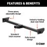 A CURT RV hitch is a trailer hitch designed to mount on a recreational vehicle to tow along a few toys, add extra cargo space or to allow a vehicle to be flat-towed behind the RV. These hitches are manufactured using CURT's quality processes of robotic welding, thorough cleaning and precise finishing. Both our RV trailer hitches and RV bumper hitches are coated with a liquid A-coat and high-gloss black powder coat finish to protect against scratches, rust and UV damage, and both offer a 2" x 2" receiver tube opening to accept a ball mount or other towing accessories. CURT RV hitches are designed to fit a variety of RV styles. With two types to choose from -- an adjustable 3-piece frame-mounted style or a bumper-mounted style -- these hitches mount easily onto the frame using the included hardware. This class 3 RV hitch features a gross trailer weight capacity of 5,000 lbs. and a tongue weight capacity of 500 lbs. It is able to fit a frame up to 66" wide. It is excellent for towing a cargo carrier behind your RV, increasing your overall cargo space, or an average-size trailer, such as a utility trailer, boat trailer or recreational vehicle hauler for ATVs, personal watercraft or dirt bikes. This RV trailer hitch is also compatible with a tow dolly or tow bar for dinghy towing a small vehicle (NOTE: Never exceed the lowest weight capacity of any towing component). CURT RV hitches are not just another accessory for your motorhome; they are a dependable extension to help you achieve that ultimate RV experience every time you hit the road.