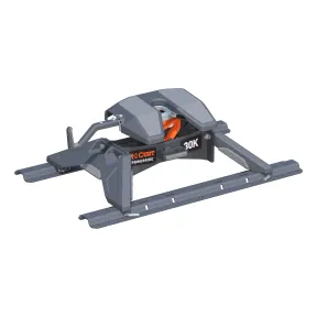 The CURT PowerRide 30K 5th wheel hitch equips your pickup truck with a profession-grade solution for 5th wheel towing. It features a 30,000-pound, fully tested rating, a cast head with multi-directional tilt, an easy-to-use self-resetting handle, enhanced portability and no welding or fabricating required for installation. This CURT 5th wheel hitch offers exceptional towing power with its 30K gross trailer weight rating and 7,500-pound vertical load limit. It is constructed with a cast steel main body for dependable strength, and it is thoroughly tested to SAE J2638 specs for safety. It's ideal for towing the largest RV trailers, camper motorhomes and other 5th wheel trailers. The PowerRide 5th wheel trailer hitch also features a cast yoke head that tilts in multiple directions -- not just forward and backward -- to promote a smooth ride. PowerRide is very easy to operate. It is engineered with a self-resetting handle, a simple mechanism that resets the jaws to the ready-to-couple position after uncoupling, saving you an extra step in the hookup process. The handle is easy to reach and operate from the side of the truck, and the hitch is also equipped with a three-position coupling indicator to further streamline the process. For installation and removal, PowerRide is unique with a one-pin head removal system. The central pin can be removed as needed, breaking the hitch down into smaller, easier-to-lift pieces. Strategically placed grips also offer a comfortable handhold. The CURT PowerRide 5th wheel hitch installs without any welding or fabricating required. It easily drops into the included industry-standard 5th wheel rails. This kit comes with the hitch head, legs and base rails. Brackets must be purchased separately.