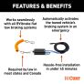 - Automatically activates the towed vehicle’s braking system in an emergency