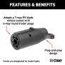 There are several different types of connectors used to supply power from a tow vehicle's electrical system to a trailer's wiring system. Some trailers only need the bare essentials -- running lights, brake lights and turn signals -- while others require a connection for reverse lights, electric brakes and auxiliary power. With connectors ranging from simple to complex, it may be the case that the connection between your vehicle and your trailer is not a perfect match. For example, your truck may be equipped with a 6-way round socket, but your trailer may have a 4-way flat plug. For this very common problem, CURT offers a quick and simple solution in the form of an electrical adapter. An adapter is an electrical device that allows a connection to be made between a mismatched trailer plug and vehicle socket. It easily plugs in your vehicle's electrical socket and usually requires no additional wiring. CURT offers an array of adapters to accommodate most types of plugs and sockets, including 4-way flat, 4-way round, 5-way flat, 6-way round, 7-way RV blades and more. This electrical adapter is designed to adapt a 7-way RV blade vehicle socket to fit a 6-way round trailer plug (center pin for brake lights). It features quality plastic construction and requires no splicing. All CURT wiring and electrical products come with a one-year limited warranty to give you the assurance you need to tow with confidence.