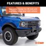 CURT tow bar base plates are engineered for a custom fit on each unique vehicle. This custom tow bar base plate fits select years of the Ford Bronco with modular or standard D-ring bumper (see application info to verify fitment). It features an OE style design to fully integrate with the front of the vehicle and maintain a factory look. This Ford Bronco tow bar baseplate is constructed from high-quality steel and is precisely welded for a perfect fit. It is physically tested for absolute safety and peace of mind while dinghy towing. It also features a unique co-cured finish of liquid A-coat and highly durable powder coat to protect against the outdoor elements. This base plate for towing comes with attachment tabs, safety cables and installation hardware.