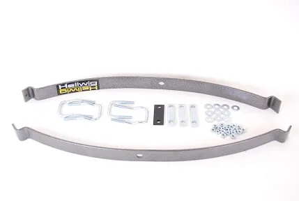 Hellwig's medium-duty EZ-990 Helper Springs pack a lot of capability in every box. Packaged complete with the same heavy duty powder coated and plated components, hardware and installation instructions as our heavy duty helper spring products, these kits are designed for the vehicles that need lighter assistance in carrying a load. Simple bolt on design using common hand tools provide the installer ease of installation and the vehicle owner hassle free use. Ideally suited for light towing and loads, these units are fully adjustable using the heavy duty U-bolts included in the kit using simple hand tools. If your tow and haul needs change, simply adjust the heavy duty U-bolts to suit the new load requirements. Once installed and adjusted you are free to haul or tow with greater control and stability. Manufactured with heat treated ASTM 5160 alloy spring steel in our California based facility, these units are rated up to 2,000 lb. level load carrying capacity. They are a great cost effective spring solution and can be adjusted independently for uneven side to side loads.