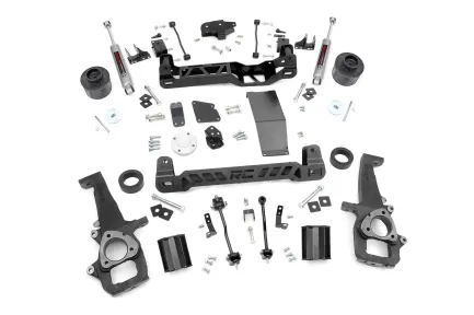 - Front Components: lifted knuckles, strut spacers, front crossmember, rear crossmember, differential drop brackets, driveshaft spacer, sway-bar links, skid plate, hardware