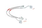Upgrade your worn out rubber brake lines with Rough Country's Stainless Extended Steel Brake Line Kit. Our DOT approved brake line kits offer the necessary extra length to install your application, perfect for anyone who wants to swap out poor performing or decaying factory brake lines. Rough Country's Stainless Steel replacements offer superior protection and a seriously long lifespan. A braided stainless steel exterior keeps your lines free from off-road debris, rocks, and mud that can penetrate factory rubber lines. This durable outer layer also prevents expansion of the internal Teflon layer - even under 4,000PSI - keeping fluid moving to the brake line for a noticeably firmer brake pedal feel. High-quality hollow fasteners at both ends of each brake line provide a leak-free flow path. s at both ends of each brake line provide a leak-free flow path.