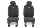 Want to protect your seats or are your seats showing signs of wear and tear from daily use? Say goodbye to unsightly stains and deterioration with Rough Country's Neoprene Seat Covers - the ultimate solution for preserving your vehicle's interior. Snug Fit for Optimal Protection: Our seat covers are tailored to fit your seats perfectly, providing a protective barrier against spills, scratches, and everyday wear and tear. Factory-Spec Construction: Engineered to meet factory specifications, our covers blend seamlessly with your vehicle's interior, giving it a fresh, new look without compromising on quality or style. Four-Layer Defense: With a four-layer construction featuring foam padding and a durable polyester shell, our seat covers offer unmatched protection and longevity, ensuring your seats stay looking new for years to come. Breathable and Water-Resistant: The neoprene layer not only provides breathability for added comfort but also boasts water-resistant properties, safeguarding your seats from spills and stains. Complete Coverage: Our covers come with full protection for your front seats, including headrest covers where applicable, as well as rear covers to shield your back seats from children and pet-related mishaps. Peace of Mind Warranty: Rest easy knowing your purchase is backed by our two-year warranty, giving you confidence in the durability and reliability of our product. Don't let worn-out seats diminish your driving experience. Upgrade to Neoprene Seat Covers today and enjoy a fresh, stylish interior that's protected against the rigors of daily life on the road.