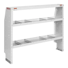 Adjustable van shelving units help maximize van storage customization and capacity. Model 9355-3-03 includes 3 shelves and measures 44 in high, 52 in wide and 13-1/2 in deep when assembled. New design adjustable shelves are deeper to hold more tools and equipment and have captive nuts at each corner for easier assembly and quieter operation. Accessory mounting holes in the shelves eliminate the need for mounting brackets or drilling. Manufactured of heavy gauge steel and fully hemmed for extra strength and durability. Includes two tapered end panels and a set of four adjustable dividers for each shelf.