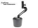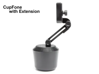 CupFone is a mobile phone holder that sits conveniently in any vehicle's cup-holder. Fully adjustable tilt and rotation allows you to easily see your favorite app like Navigation or Waze when on the road. The included CupFone Extension allows you to raise your phone up to 4" higher and tilt your phone forward or rearward 4" in any direction so it's easier to view and reach. Makes hands free voice commands easy to use along with hands free telephone calls. Allows you to leave your phone plugged in while it is in the holder and you can effortlessly, and with one hand, remove your phone from the holder or replace it without ever having to disconnect your charging cord. Fits mobile devices that measure between 2 3/8" wide to 3 3/8" wide and 9/16" deep